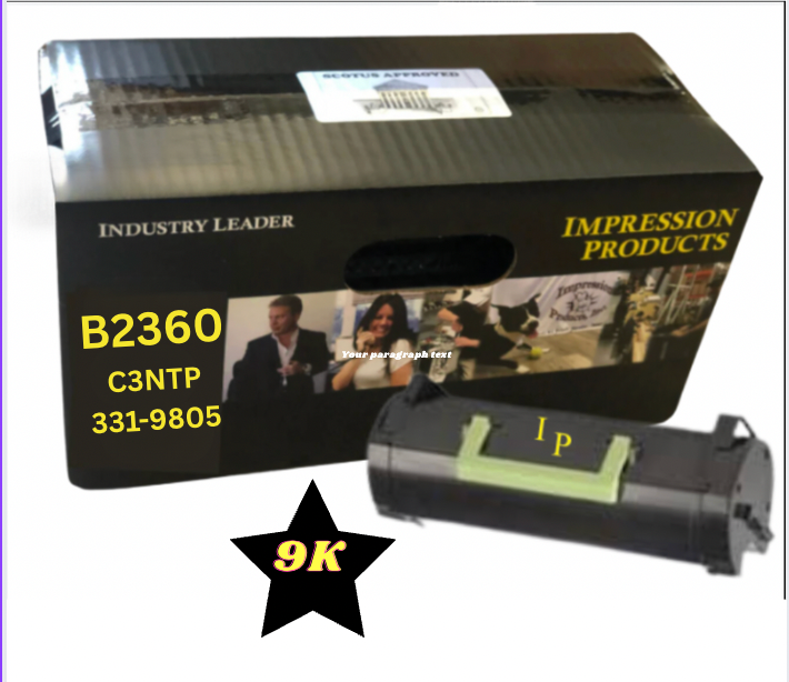 The Impression Products Compatible Black Toner Cartridge for Dell B2360 series printers (C3NTP / 331-9805) offers dependable performance and crisp print quality for everyday business use. This remanufactured cartridge is a cost-effective, eco-friendly alternative to OEM Dell toner.